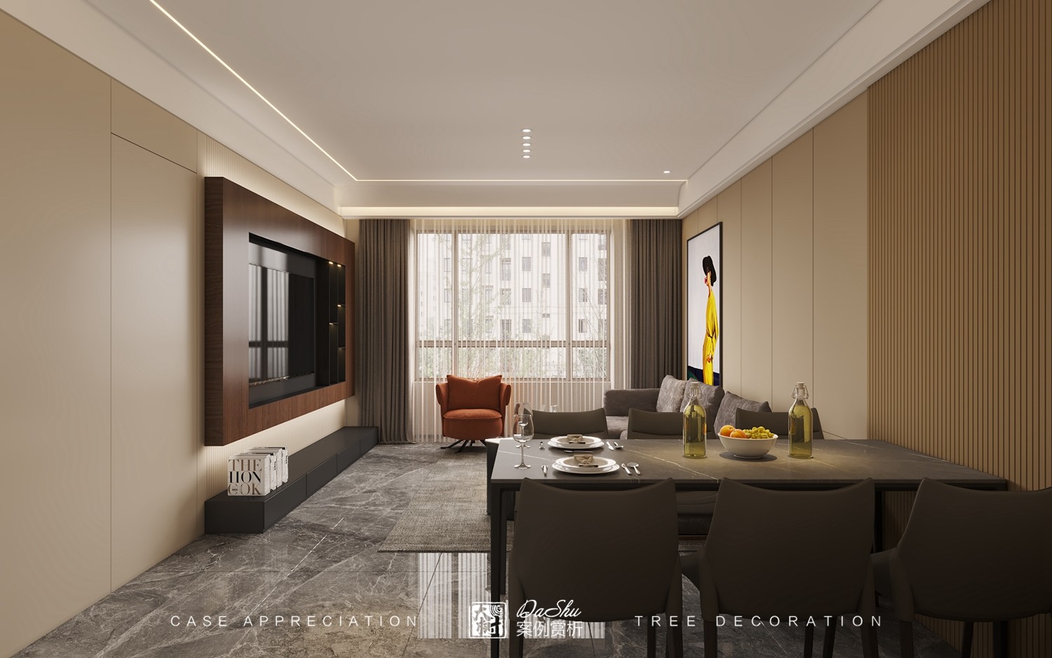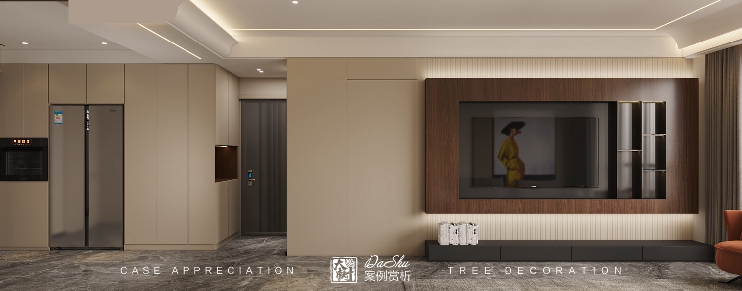本案以极简咖色为主,干净的颜色,彰显低调沉稳。浅胡桃色木饰面在空间中占主导,低饱和度的治愈氛围,给人宁静朴素、轻松舒适的感觉。