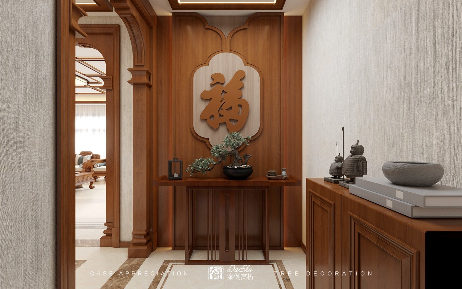 在一个家中,玄关的位置很重要,一个寓意好的装饰在家中尤为重要。在本案新中式的风格中,入户位置雕刻“福”字,寓意开门见福、多财多福。